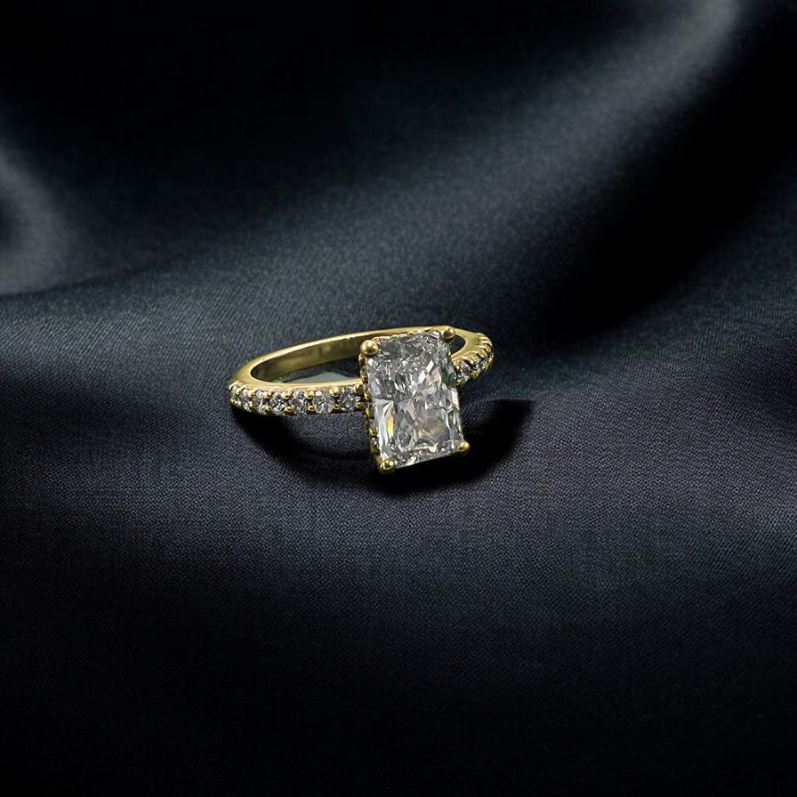 This exquisite 1.5ct radiant cut lab-grown diamond showcases D/F colour and VS2 clarity, delivering exceptional brilliance and fire. Set in 9ct gold, the centre stone is enhanced by a hidden halo a sophisticated design element that amplifies sparkle while maintaining a clean, minimalist aesthetic from above. Complementary diamonds set along the band create a seamless flow of light and elegance. Lab-grown diamonds offer identical optical and physical properties to mined alternatives with superior value. An ideal choice for those seeking a refined, contemporary engagement ring that balances understated beauty with undeniable radiance.